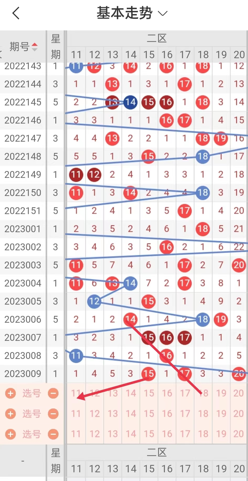 接着我们来看二区号码,二区上期开出15.17.20这三个数,从个人角度看,15.17中间隔16,17.20中间隔了18.19。15~20下期不重号的情况下基本上就选18.19中一个了。然后另外就是从15号以前的数字中考虑出号,从走势图中看,最热的号码为11,最冷的号码为12.所以我看号码11开出的机率会比12高。二区的号码中可关注我图中指示的两个数字。