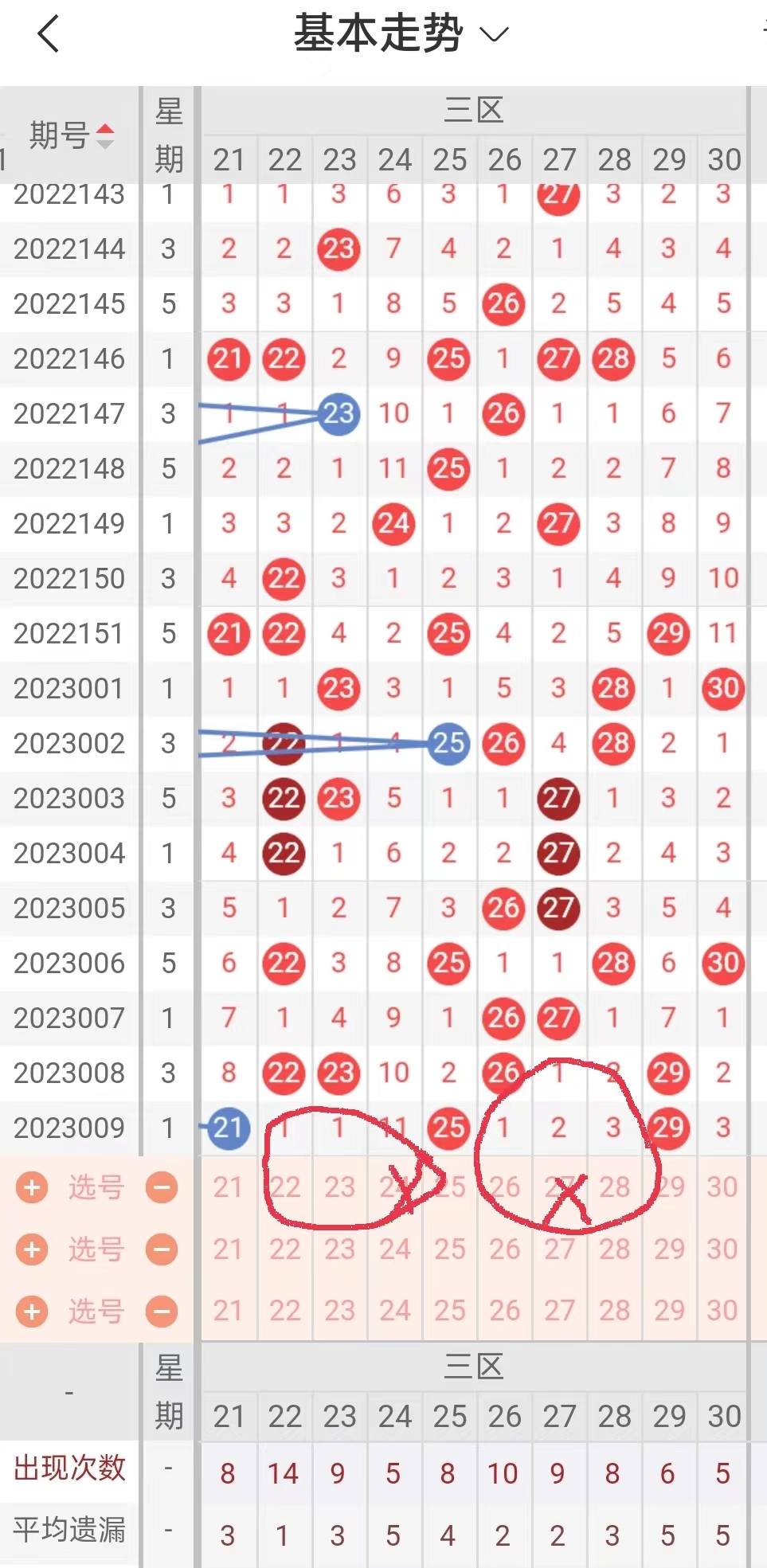 最后就是三区,上期开出21.25.29其中21是特别号码,不过在我眼里把它当普通号码看,更容易分析走势,三区看了看图,最后觉得以一区的方式来选三区的号码也是可以的,这样的话范围就缩小了不少,图中我画圈选择了范围后又杀掉了2隔号码,主要是因为觉得这2个号码的摇出率不是太高,第一个是24,因为它是一个冷号,还是一个5连斜号,认为出来的概率不是太大,还有一个号码是27,此号为为25.29正中间号码,另外下期开27的话,本身还有个规律性,在这里也把它看成极小概率会出,故直接杀掉算了,可以更好的选择其他号码。