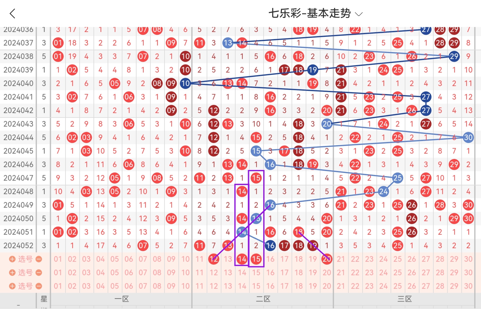 二区间上期(2024052期)开出了六码11-13-16-17-18-19,开出了独码和分边号码和连号,本期做号需要注意连号位置如何落码以及斜连走势号码能否开出,和独码位置能否有落码,从近期该区间上开出的独码来看,在2024049期开出独码后下期独码分了边,在2024051期开出独码后下期独码走了重,本期独码位置需要仔细研判考虑,从近期该区间上开出的连号来看,在2024046期开出连号后下期连号走了重和分了边,在2024050期开出连号后下期连号也走了重和分了边,本期连号位置号码需要仔细研判考虑,本期首先需要关注的号码【12】五斜连走势号码,然后是【14】重号隔期回补带对称,其次是【15】和【20】其中15两期跳空对称形态,【20】三斜连走势号码,本期重点关注号码【12 14 15 20】