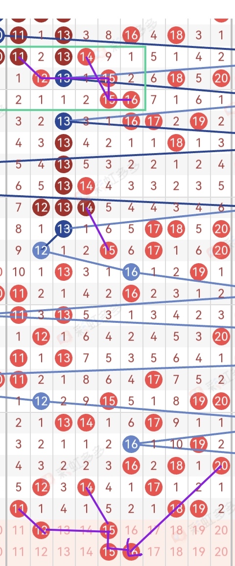首先我们来看第一区间的走势分析。先看第一次走势分析,即使图中紫色线标明的:01、02下面开04、05,那么本期看07、08开出,在这里07的间隔走势为1-4-1走势,也是对称走势,那么在这里大家可以关注一下07码的落位。下面在看06在此落码,与04、05构成三斜连的形态,在刚才我们提到的07走势落码中,大家如果想操作的那么在这里可以带上06一期操作,在近期中06、07两码也频繁同出,在图中卧龍先生已经标明清楚。下面再来看最后一种走势,即是用橘黄色箭头标注出来的同上面相同的走势,在这里也是看好05走重,走重后在下一期开出06号码球,那么在此的做号同样可以和07号码一同考虑,在下一期中开出06、08两码,在23096、23108和23110三期中均出现06、08两码同出的走势。下面我们来看二区间的走势分析。在二区间的研判我们首先看20-18-16间隔三斜连的走势,那么在这里看好下一期开16,回过头来看上期11落码,本期看好临码12落下,14落码后间隔一期落15的走势在往期中也出现过,在图中已经标明。那么根据以上的走势得出12、15两码落下又可以看到与卧龍先生画框的地方构成了相同的走势,且刚才我们研判的三斜连下期出16在此的走势也对的上,那么本期我们看好12、15两码落下,若本期两码落下,下期我们重点看重码15与临码16的落下。最后防守一下20号码球。下面我们来看三区间的走势分析。三区间我们在这里重点看22、23两码,收下看22号码球,具体走势可以看23111和23112两期的走势,在此我们看29、30落码后带22出来形成相同的走势,其次是23号码球与21号码球遥相呼应,上一期21落码,在此我们看23号码球落下。下面我们看蓝球的走势分析。蓝球在此的落码有以下几个:9、10、13、26、28,那么在此的研判我们看好本期号码大小继续下滑开出小码,那么在此重点关注9、10、13三个号码球,在往期开奖中13号码球与24号码球的联系较为紧密,在23096和23098两期中就可以看出,那么在此我们重点关注13号码球的开出,同时防守9、10两码的落下。
