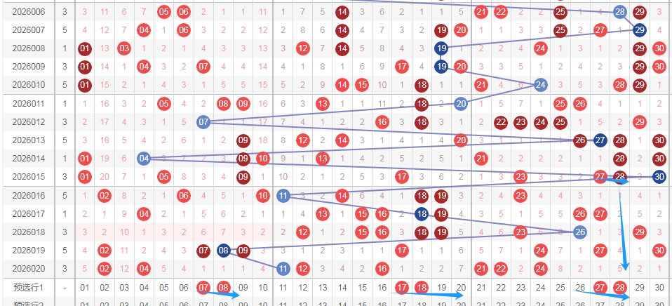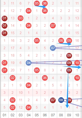 上图是福彩七乐彩开奖号码走势分布图其中一部分走势图,号码从数字01到数字10这个区域,你们看看上面走势图中标注出来的蓝色箭头表示的就是连号组合,最近这个区域的连号组合遗漏了6期上次遗漏了2期,这个区域本期或者近期大家可以看看出连号组合一组或者两组,个人最喜欢连号组合0203 0304 0607 0809。