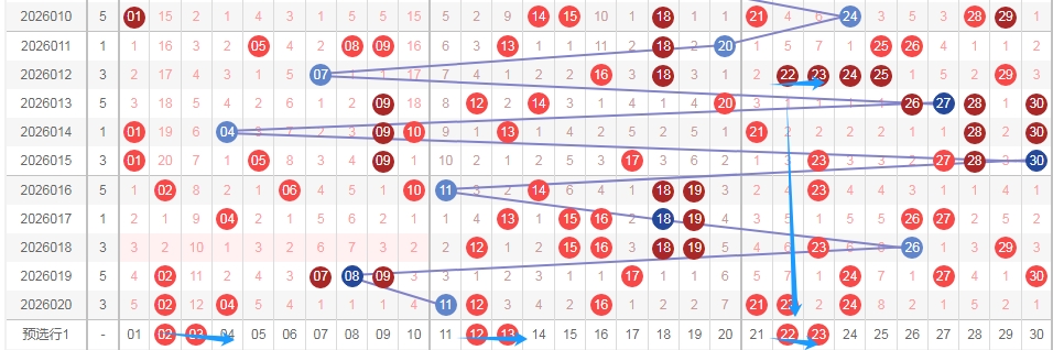 上图是福彩七乐彩开奖号码走势分布图,我在上面福彩七乐彩走势图中标注出来的蓝色小箭头表示的都是2尾数数字和3尾数数字组成的连号组合一共三组,分别是0203 1213 2223,最近这3组连号组合已经连续遗漏了8期,那么本期或者近期可以关注这些连号组合出现。