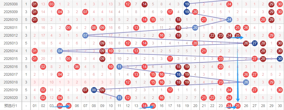 上图是福彩七乐彩开奖号码走势分布图,我在上面福彩七乐彩走势图中标注出来的蓝色小箭头表示的都是4尾数数字和5尾数数字组成的连号组合一共三组,分别是0405 1415 2425,最近这3组连号组合已经连续遗漏了8期,那么本期或者近期可以关注这些连号组合出现。