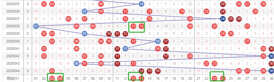 上图是福彩七乐彩开奖号码走势分布图,我标注出来的绿色框框看看都是3尾数数字和4尾数数字组成的连号组合,分别是连号组合0304 1314 2324到本期为止这3组连号组合已经连续遗漏了6期,上次是开出了连号组合1314中间上面标注出来的绿色框框,那么本期或者近期大家还是要留意一下这三组连号组合。