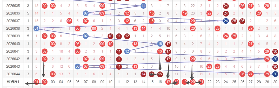 上图是福彩七乐彩开奖号码走势分布图,我标注出来的黑色小箭头看看,上期开出了15 16其中数字16是隔两期出现的,那么根据这个特点,本期可以考虑一下0102组合其中数字02是隔两期出现的,考虑一下1718组合其中数字17是隔两期出现的,考虑一下1920组合其中数字20是隔两期出现的,考虑一下2021组合其中数字20是隔两期出现的。