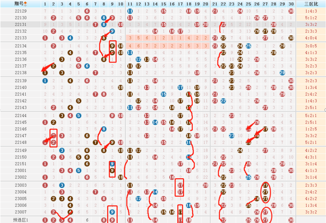 根据最近30期走势图,开出次数比较多的作为基本盘,同时参考三区号码往期的直落,边号,隔期规律形态,我们可以关注红球22 25 26 27 30 ,然后从中选出2~3码。