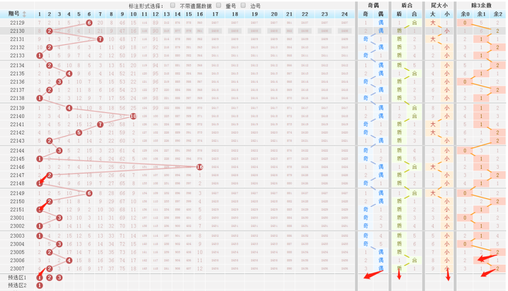 从龙头定位走势图我们可以看出,龙头热出号码基本盘有1 2 3,占绝对优势,根据奇偶+012路,本期大概率是1总结:龙头推荐1 2 3 -- 1 ,上期3码中
