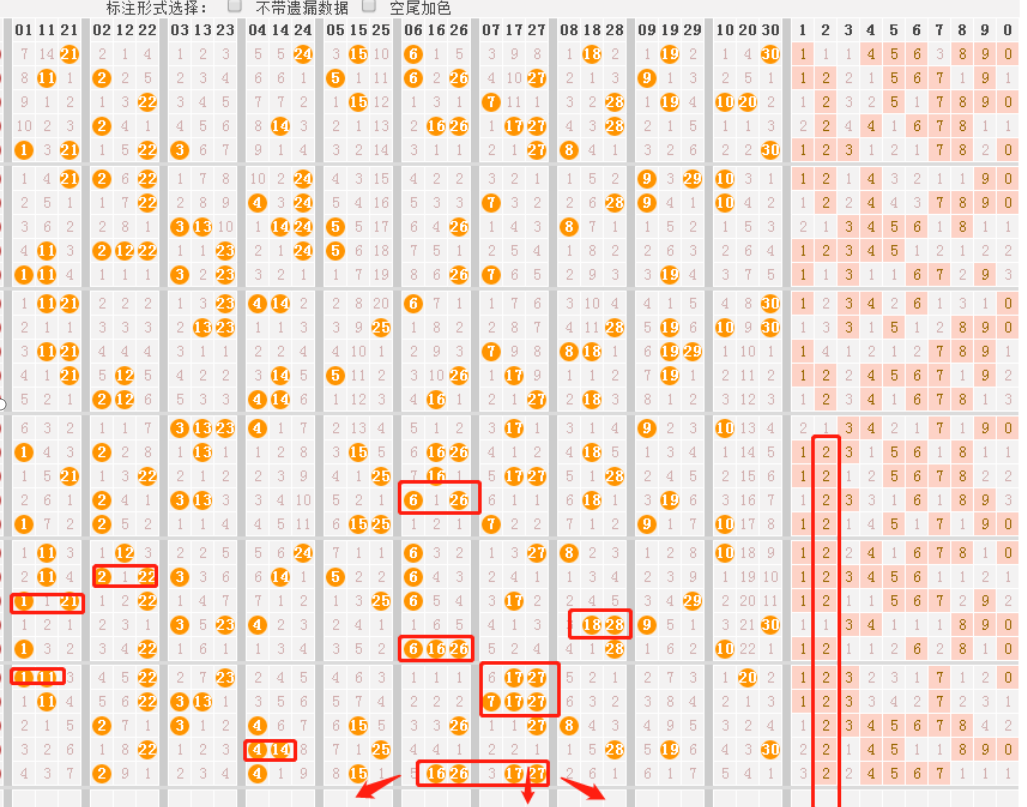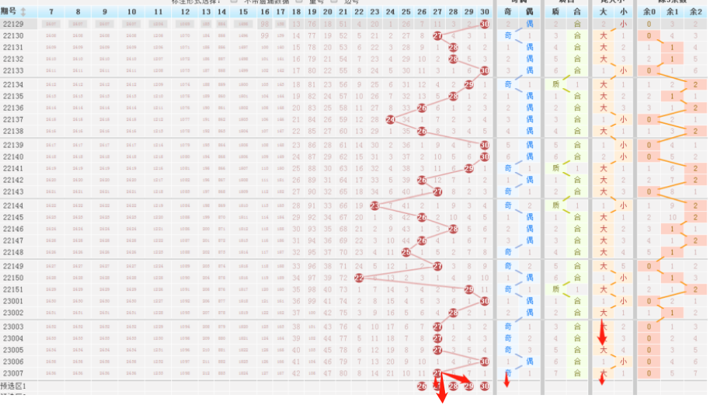从凤尾走势图,我们可以看出基本盘26 27 28 29 30,根据奇偶走势图+尾大小走势图,本期大概率走奇+大尾,剩余27 29。