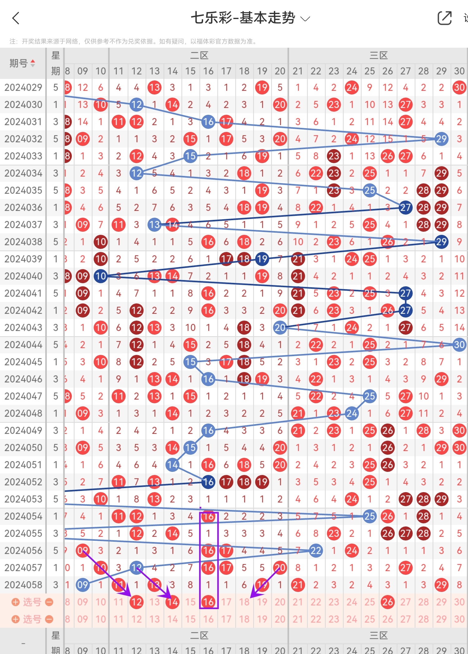二区间上期(2024058期)开出了三码11-13-19,开出了分边号码,本期做号需要注意斜连走势号码能否开出,号码落位在了区间两端,本期还需注意中端空白区域号码回补落码,区间连续两期走热开出三码落位后,本期在号码落位上是否会继续开出多码落码需要仔细研判考虑,本期首先需要关注的号码【12】隔期对称形态带四斜连走势和夹号形态,然后是【14】三期跳空对称形态带三斜连走势,其次是【16】重号隔期回补带对称形态,【18】重号六期回补带三斜连走势,本期重点关注号码【12 14 16 18】