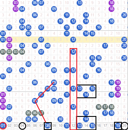 上期该区间开出五个号码球,正常的大盘走势,本期我们防守减码开出,首先上期热号02开出,本期考虑它的邻号01,01有个空二走势对称期间这里要关注下,上期走出俩重号好的05 06本期会有一个走重这里看好05,遗漏8期的04本期可以小防一下,在看08有个斜线走势如图所画,一字头这里先看11和19遗漏四期二者本期会有一码开出,12遗漏二期对称期,这里要防守下即可,再看梅花13 15和上边的反梅花走势相似,14不走三重二者有机会落一码