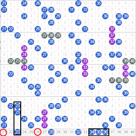 上期该区间开出5个号码球,正常走势开出。本期预测加码开出,首先看21本期防走三重的机会,其次23和39都是遗漏二期的走势,本期二者可选一,上期加号25开出本期守选考虑它的走重,其次防守下26这个加号,感觉26加号开出的几率不是很大,28遗漏三期对称期间本期有机会落下,29蹦跶号空一走势,本期小防守下,32-34 35 36这个假五连本期是要防守下的,40号球本期要关注下