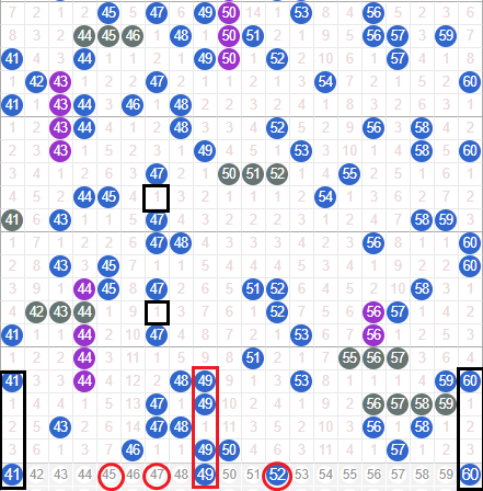 上期开区间开出四个号码球,本期考虑持续走热,先看41和60都是遗漏三期的号码,本期二者可以选一个落,个人更看好60,再看44热号上边有个遗漏三期的对称期,本期落码机会比较大的,上期冷号46和50开出,本期二者选一个做号,个人更看好50落号,选择50走重那么45 47 48三者会有一码开出了,这里要关注下,52到59之间我选择了防守这里就么有选号