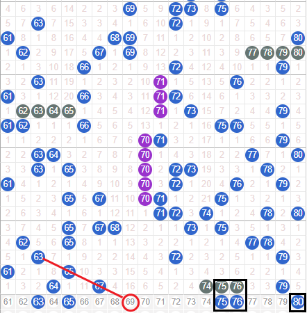 上期开区间开出6个号码球,算是小回暖的走势,本期该区间还会回暖的走势,首先关注小梅花图案63 65二者会有一个吗,个人看好65,65是个蹦跶号最近空一开出的走势还是比较大的,其次防守开区间的69本期有斜线走势,这里可以防守下了,再看上期开出的三连号本期是要有重号开出,按照以为的三连号做号来看,本期75 76二者几率大一些,凤尾80本期可以关注下本期不出就可以放弃了,选76就不要选80二者同出的几率不是很大