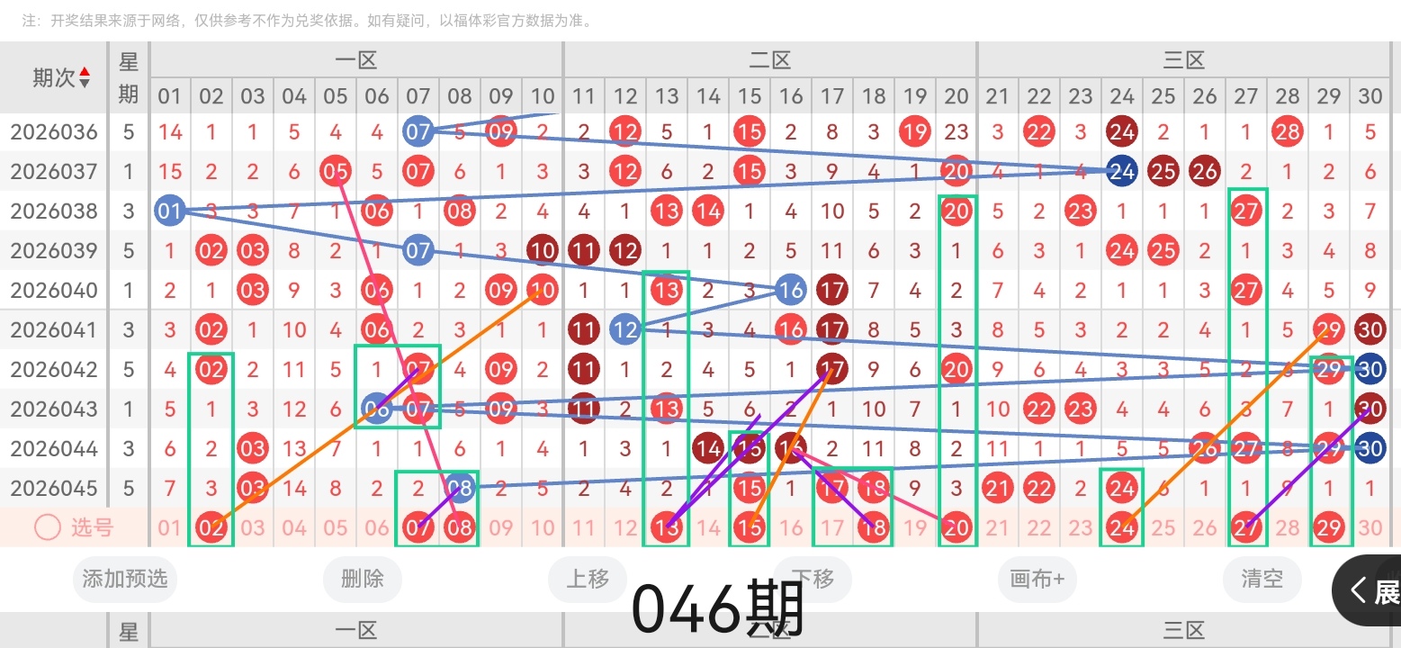 通过对上期的开奖号码简单回顾,下面进入七乐彩第2026046期(下面简称本期)的选号分析: