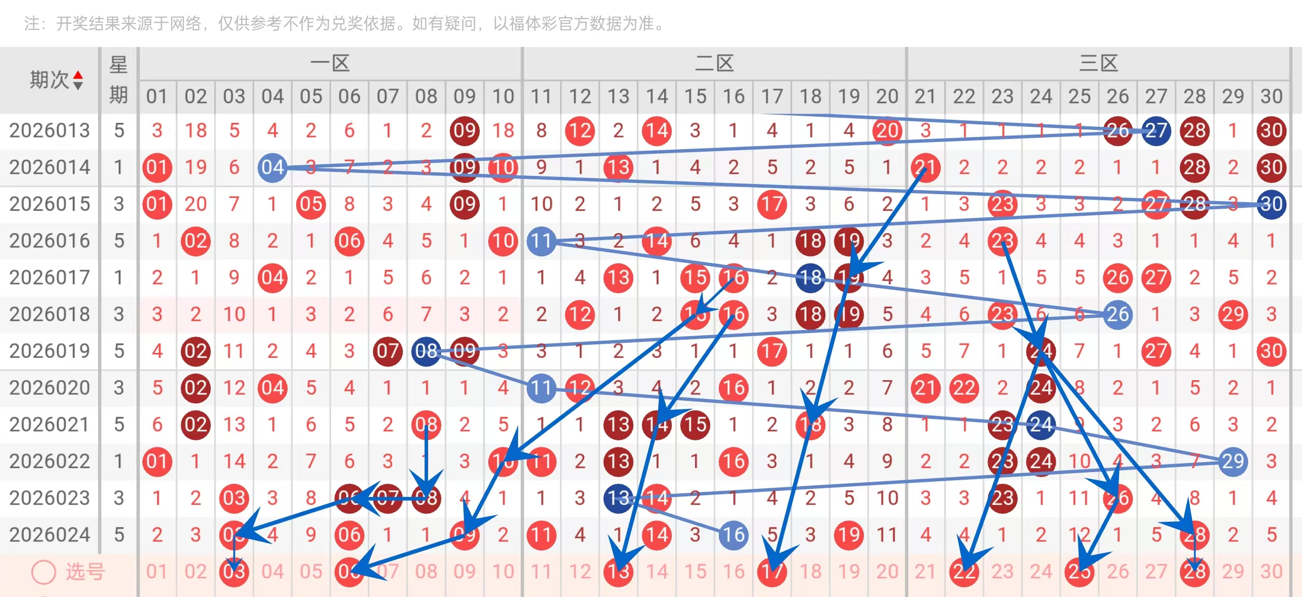 七乐彩前区分为三个区间:一区01-10、二区11-20、三区21-30。最新一期区间比为3:3:1,三区严重遇冷。推荐号码中: