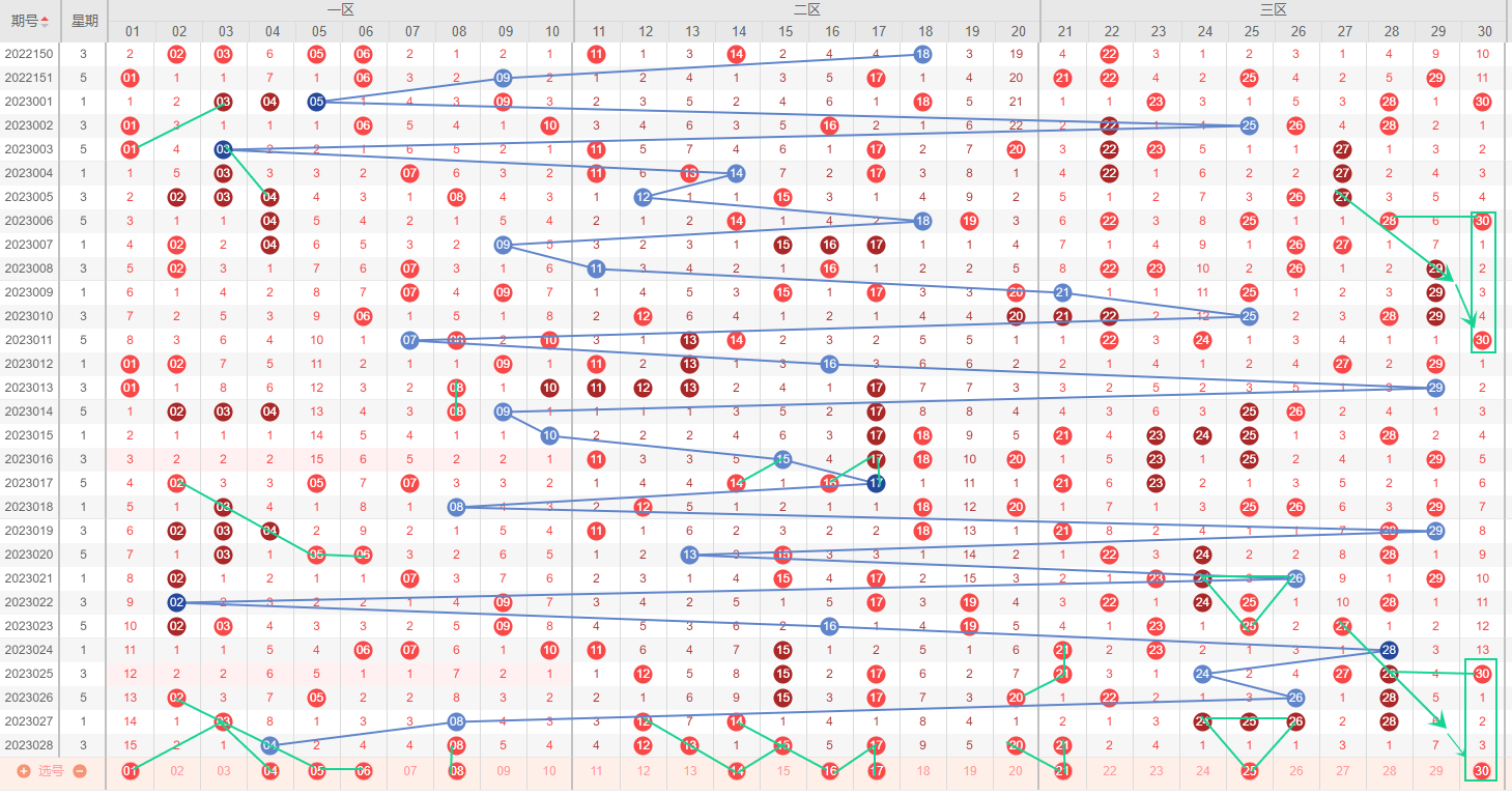 9、七乐彩的三分区:一区范围:1-10 ;二区范围:11-20;三区范围:21-30;