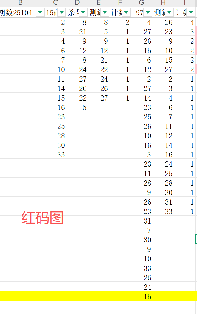 得出一组红码数据就是:2 3 4 6 7 10 11 14 15 16 23 25 28 30 33