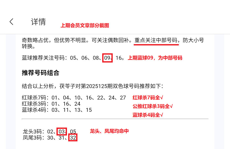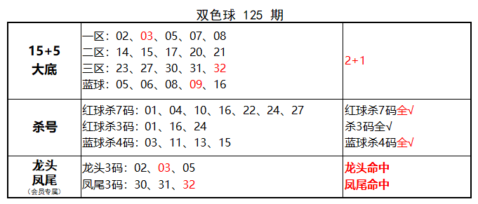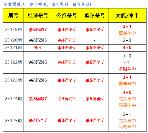 上期红球杀7码全对,免费文章杀3码全对,蓝球杀4码全对,龙头凤尾均命中,上期红球命中4码,本期再接再厉!