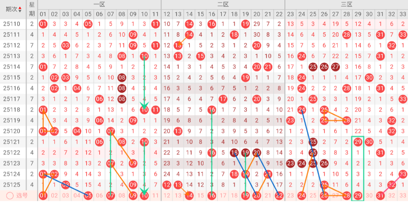 第三区间(23-33):三区上期开出号码26 32,近5期出号量3-2-4-1-2。本期三连号趋势:31,隔码斜连趋势:26。近5期平均出号2.4枚,平均出号增加。虽然上期仅开2码,但考虑到前一期为1码的低位,目前的2码属于从低位的正常回升。建议关注号码:24、26、28、29、31。