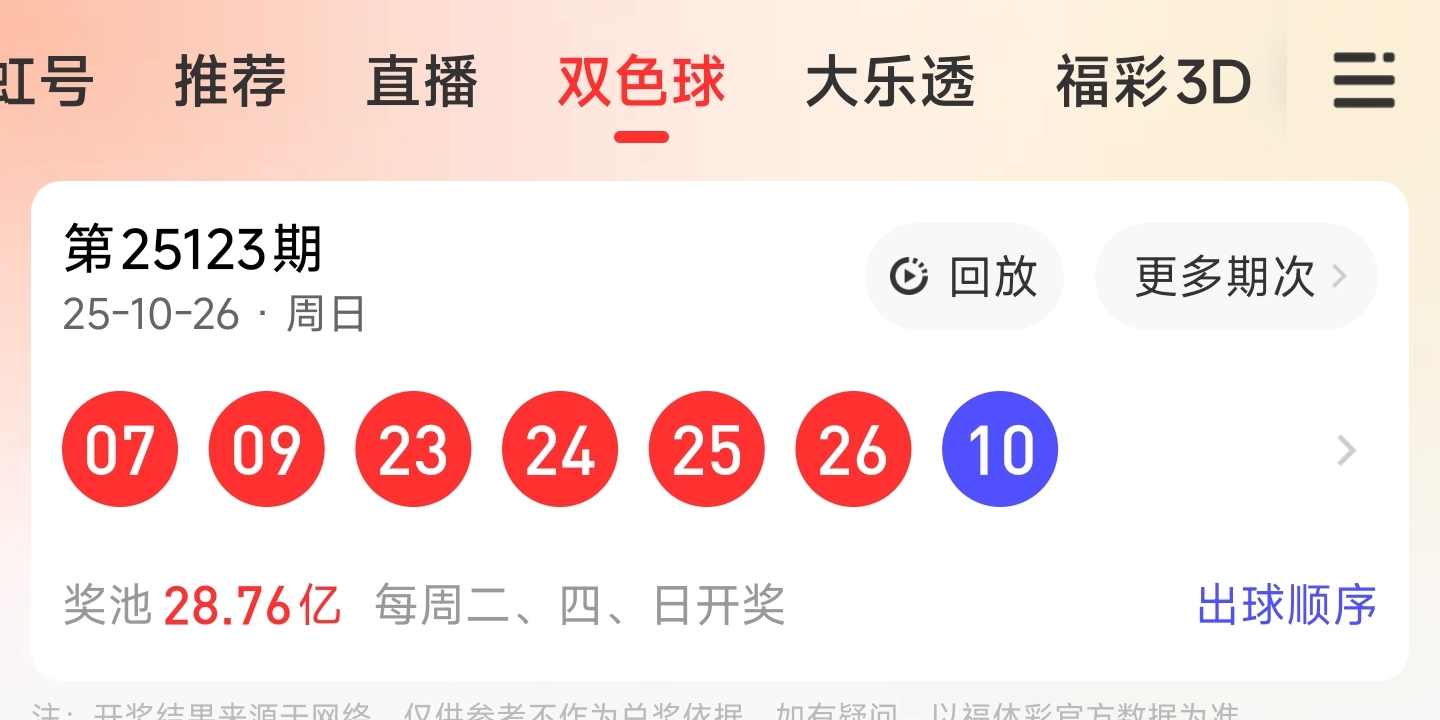 红球开出7,9,23,24,25,26。蓝球开出10。