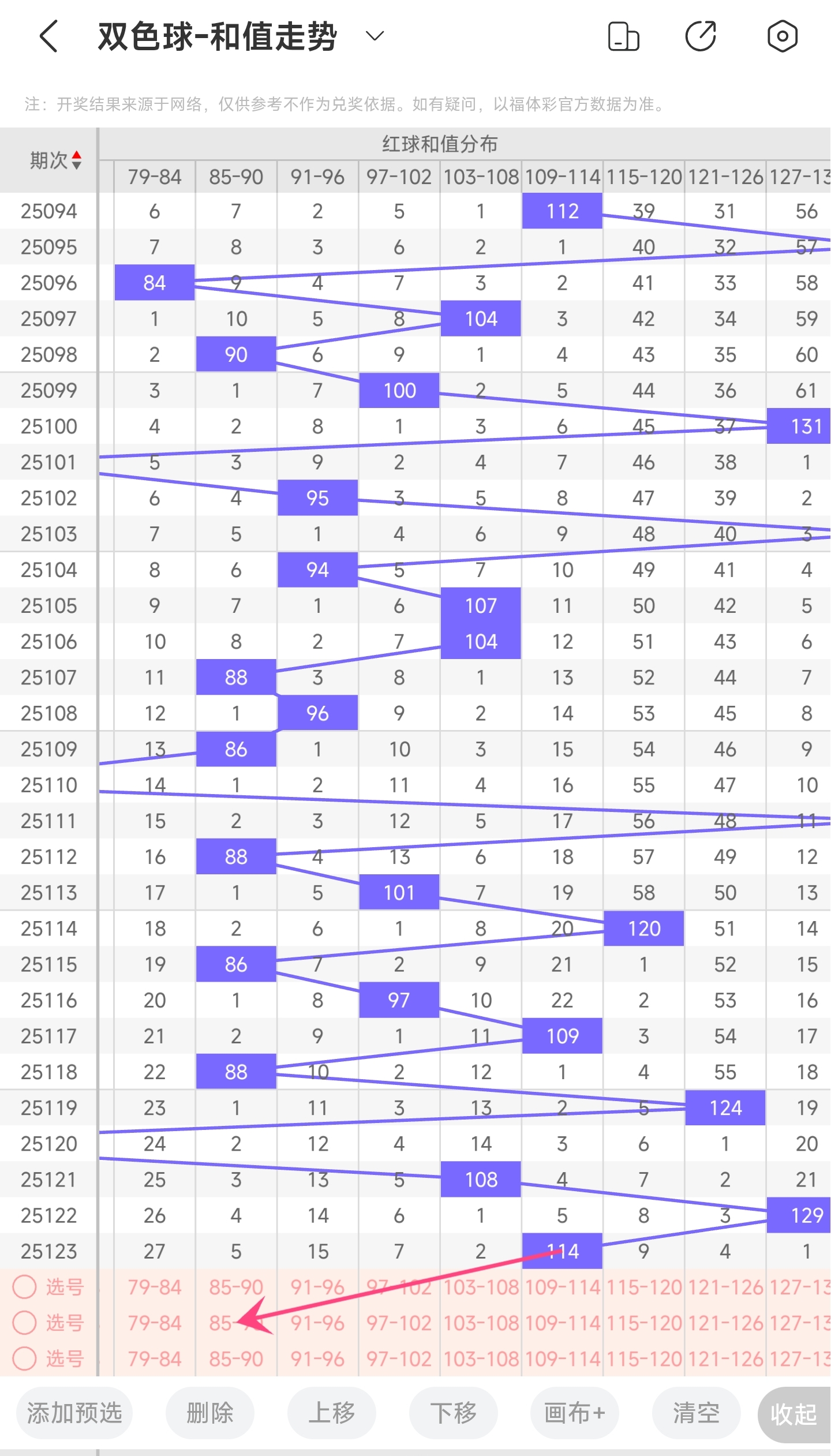 上期和值为114,而近5期和值为124,59,108,129,114均值106.8,上期和值较前一期减少了15,振幅为15。114和值是属于近30期内开出的比较大的和值,上升的空间已经比较小,下降的空间很大。所以推测本期和值趋势是大概率往左下降,和值变小,小概率继续往右,和值变大。
