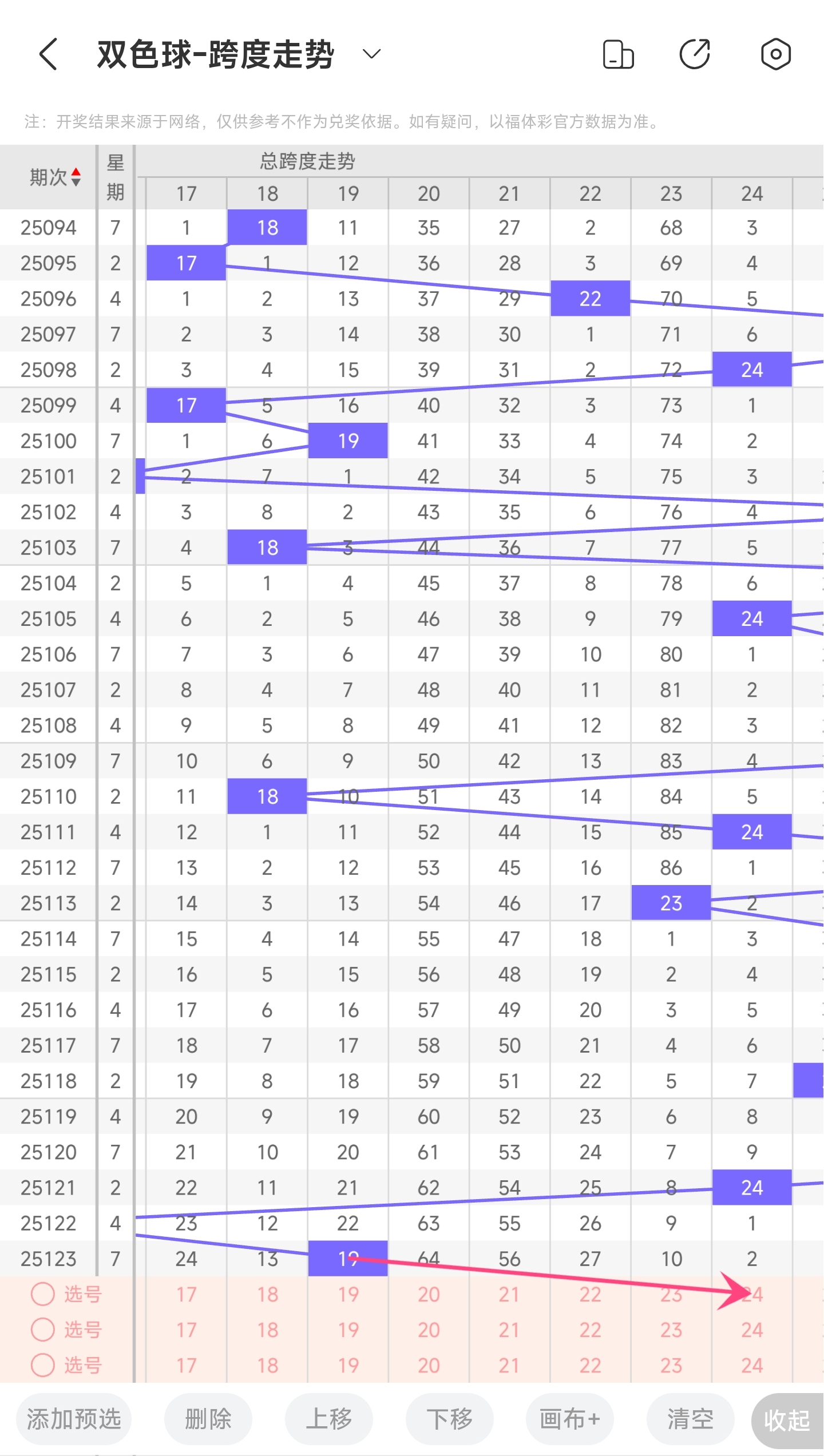 上期龙头为7,凤尾为26,跨度为19,往前一期跨度是15,偏移量为4。19跨度值是30期内开出的很小的跨度值。下降的空间是比较小的,上升空间比较大,本期看好大跨度值。因此推测本期跨度有大概率趋势是继续往右的,跨度变大,小概率往左,跨度变小。