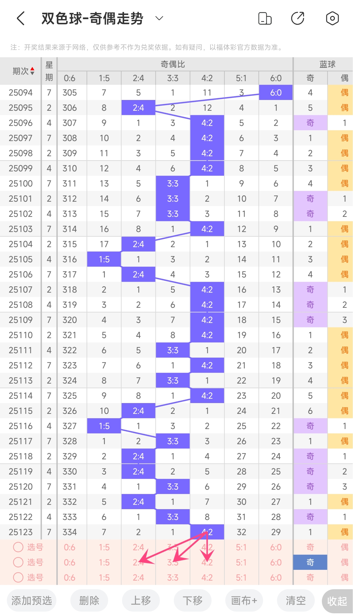 上期奇偶比为4:2,分别为奇奇奇偶奇偶。往前一期奇偶比为3:3。通过近30期内奇偶走势的数据分析,目前1:5奇偶比开出的概率是6.66%,5:1奇偶比开出的概率是0%,3:3奇偶比开出的概率是26.66%,4:2奇偶比开出的概率是40%,2:4奇偶比开出的概率是23.33%,6:0奇偶比开出的概率是3.33%。与前一期相比,4:2奇偶比变大,3:3奇偶比概率变小。通过分析走势图,可以看到4:2奇偶比回归了,继续开出的概率也比较大。所以本期推测本期可能继续开4:2奇偶比,其次是3:3奇偶比或者2:4奇偶比,最后是1:5和5:1奇偶比。