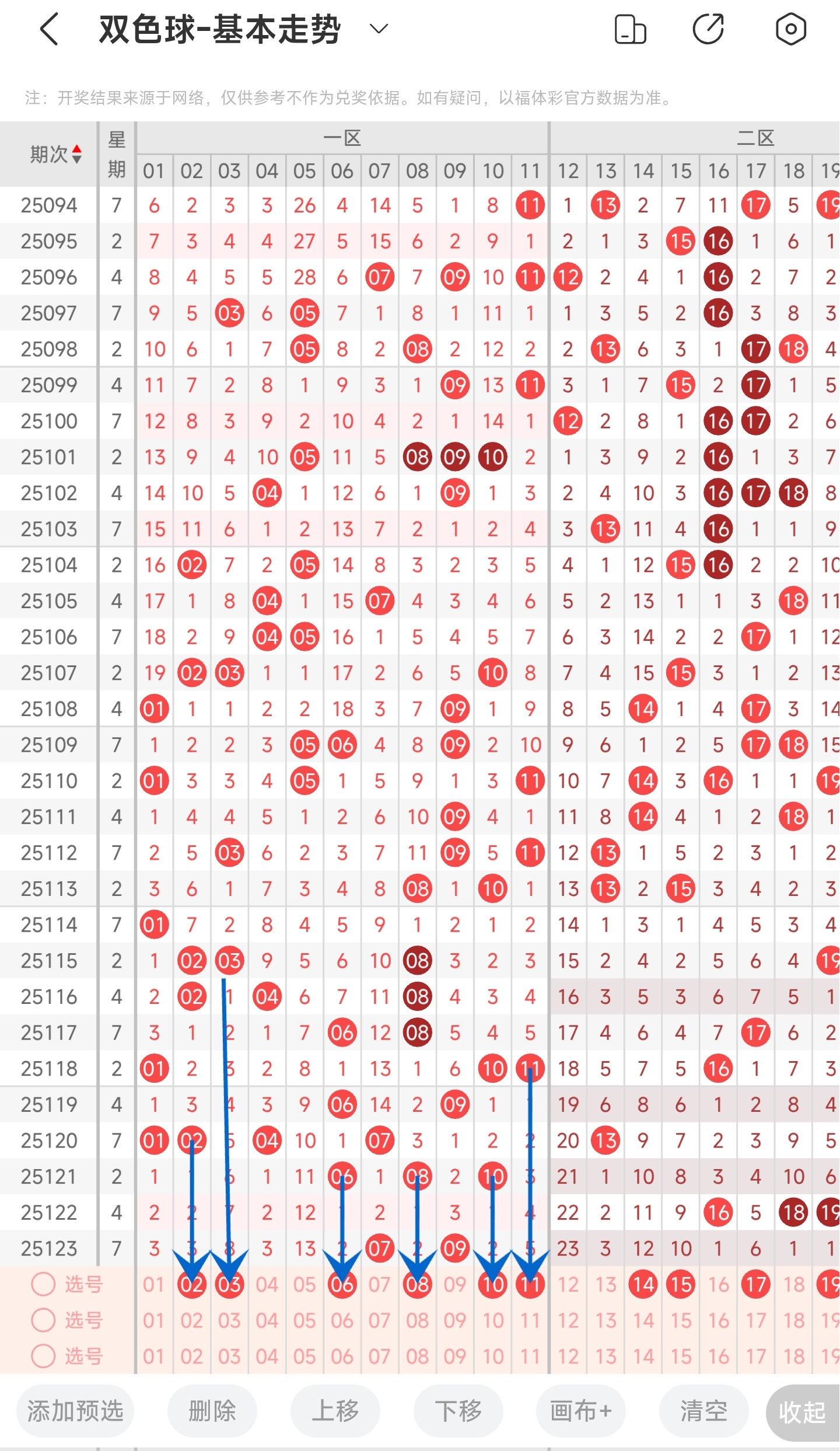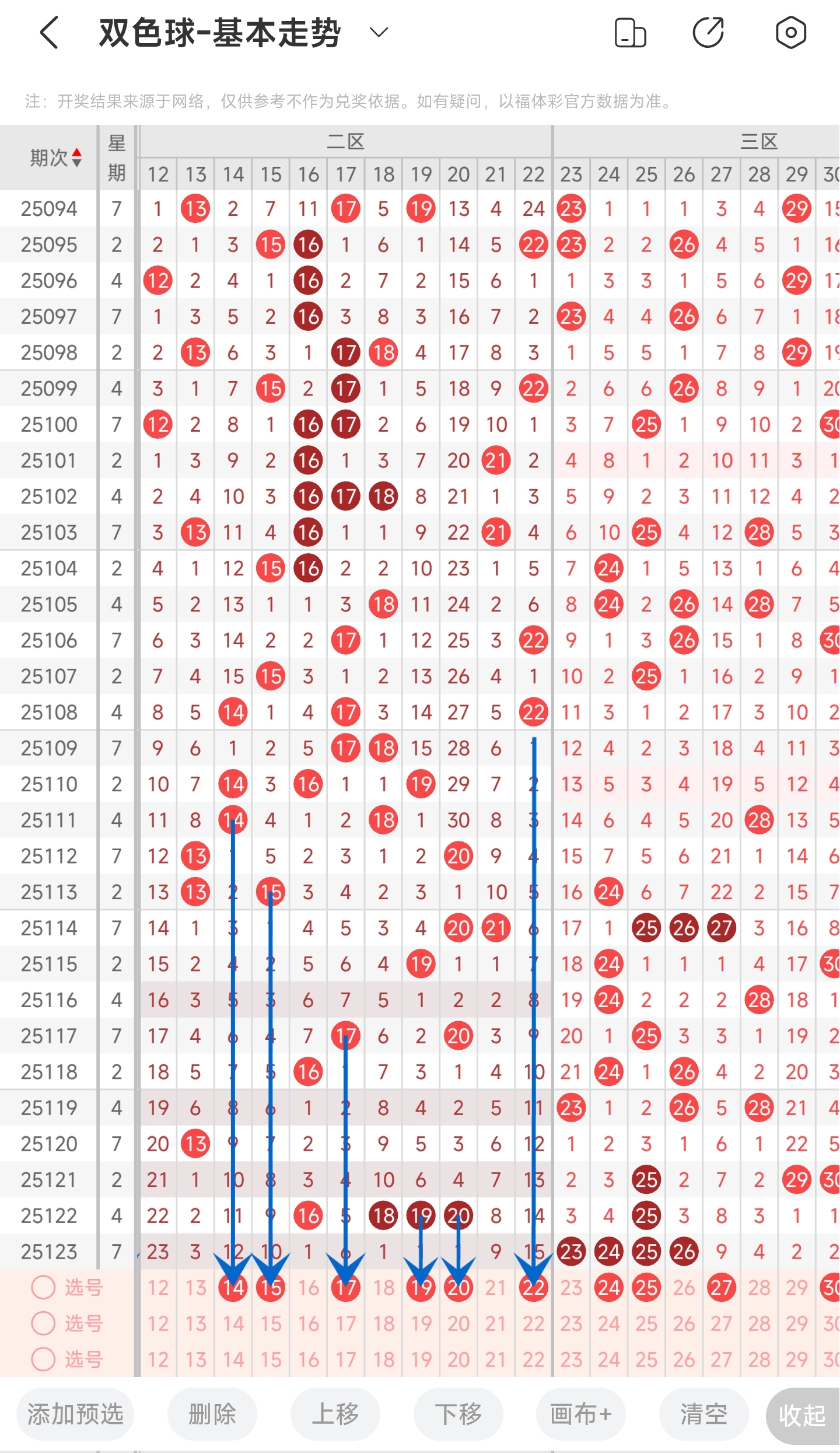 上一期二区没有开出号码。往前一期开出了16,18,19,20等号码。通过分析走势图,可以看到上期没有开出号码,往前2期也没有开出号码,本期号码大概率会回补,回补号码可能比较多也可能只回补1到2个号码。从近几期开号趋势来看,中间部分的号码比较热门可以重点关注,其次是右边的号码。最后再结合冷热号和遗漏期数,本期我们可以关注一下14,15,17,19,20,22等号码。综上所述推测本期可能开14,15,17,19,20,22等号码。