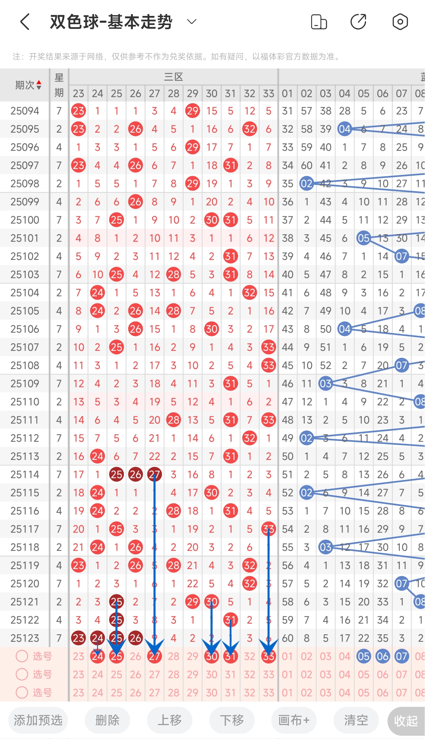 上一期三区开出了23,24,25,26等号码。往前一期出了25,31号球。通过走势图分析,可以看到上期开出4个号码,推测本期会有所减少,除此之外凤尾上期开在了左边的位置,推测本期会回补到中间或者右边,可以注意一下。然后再结合冷热号和遗漏期数,本期我们可以关注24,25,27,30,31,33等号。综上所述本期我们推测有可能开出24,25,27,30,31,33等号码。