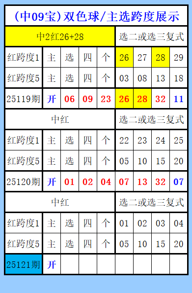 双色球第121期图文(中09宝),主选跨度展示,视频上期中蓝胆07