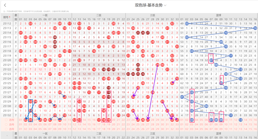 上一期三区开出了2个号码,本期三区大概率不会断区,本期三区出号数量可以考虑2个,防3个;本期三区需要关注的号码:25-16为当前三区出号热点号码;27与28-29形成了斜连走势;32可能会重出;32-33可能会同时落号;因此本期三区选号应该考虑25-26-27-32-33等号码。