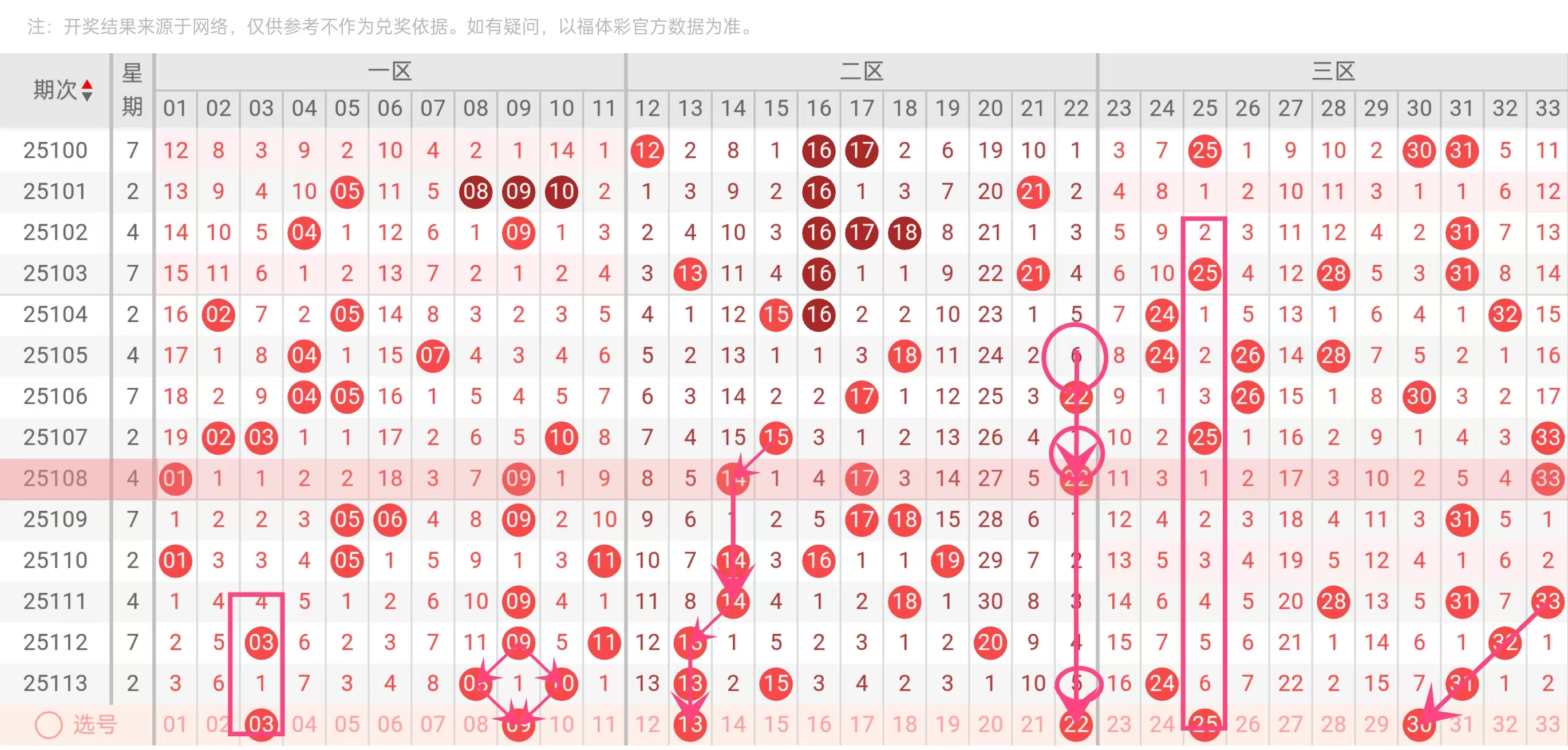 红球推荐:03、09、13、22、25、30