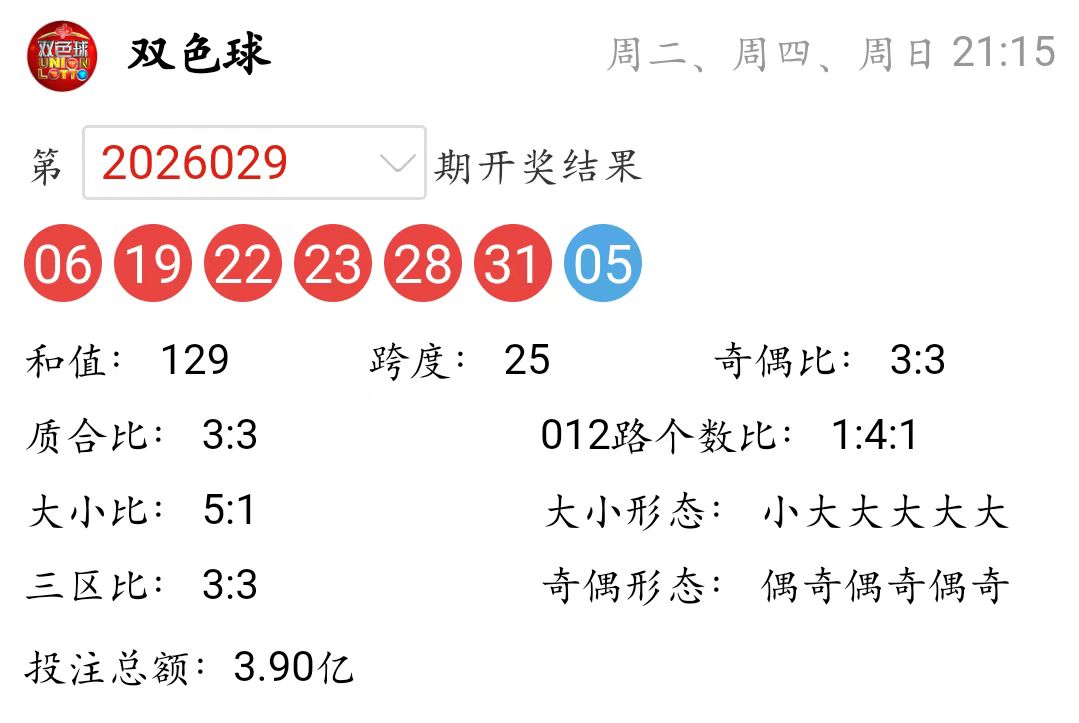 双色球上期(第2026029期)开奖详情