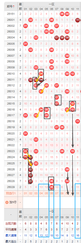 一区本期选号建议首先考虑遗漏期数较大的号,04号、05号都达到了遗漏十期以上且已到达其最大遗漏期数,是目前一区遗漏期数最大的号建议防冷号开出。其次隔断号还可以考虑09号,上次开出间隔一期,本期与上次开出刚好间隔一期,若本期开出将形成1-1的形态规律,可以考虑开出,或者考虑10号,若本期开出将形成6-6的形态规律。11号也已经遗漏十期以上,且远超平均遗漏周期,建议防冷号开出。