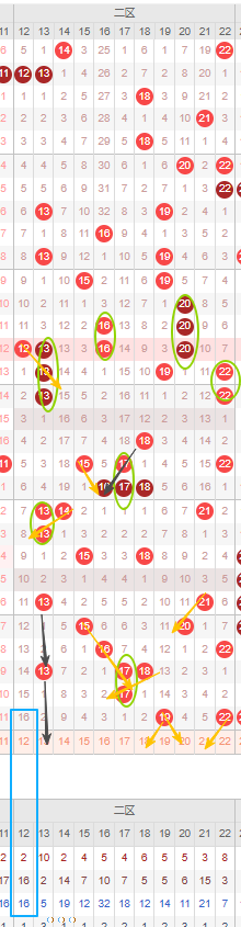 首先来看冷号12号已经遗漏了十期以上,并且已经达到平均遗漏周期,可以防冷号开出。其次二区还可以着重看隔断号。隔断号首先考虑13号,本期若开出则形成2-2的形态规律,邻号可以考虑上期开出的19号或22号的邻号,比如18号、20号、21号。