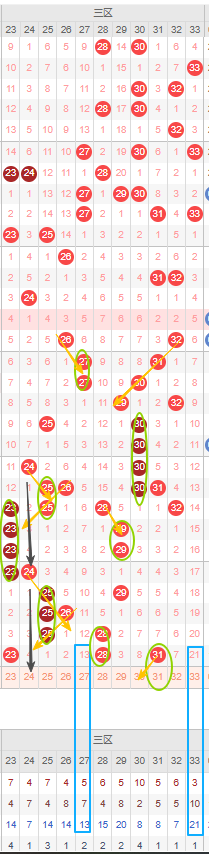 在近20期内开出了重号次数较多,其中23号、25号、30号连续开出了三重号及以上,已经是三区出现的重号连续期数最高的了,可见三区重号几率高本期重号看好28号或31号继续开出。隔断号可以考虑24号上一次开出间隔了4期本期刚好间隔了4期,若开出则形成4-4的形态。最后27号与33号遗漏期数已经有10期以上,且已经达到其本身的最大遗漏期数,可以考虑防冷号开出