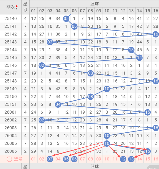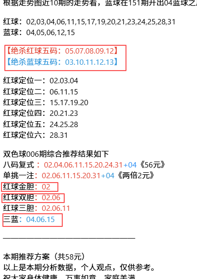 根据走势图近10期的走势看,蓝球在151期开出04蓝球之后,1大1小4大,再看下近10期的蓝球中冷码有回补的趋势,这种趋势规律本期判断极有可能开出单号,本期防蓝球04小号,蓝球本期重点关注03,05,06,12,13