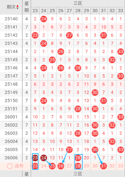 根据走势图可以看出当前区,147期开出33一个号码球 ,148期没有开出号码球 ,149期开出30一个号码球 ,150期开出24.31二个号码球 ,001期开出33一个号码球 ,002期开出30.32二个号码球 ,003期开出28.30二个号码球 ,004期开出32一个号码球 ,005期开出27.28.33三个号码球 ,006期开出23.24.28三个号码球 ,按照如此规律判断本期当前区可能开出1单或2单。我们看下当前区上期没有开出重叠号,那么本期当前区要定重叠号的情况下可关注23码球。再看下当前区上期开出28斜连号,当期选号得留意25斜连号。本区重点关注23.25.26.28.31