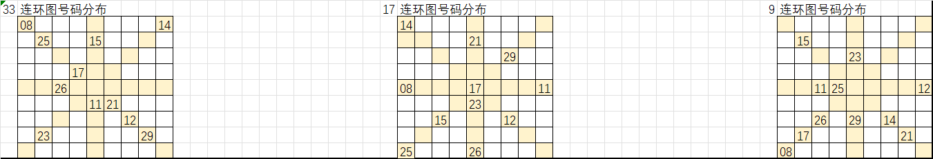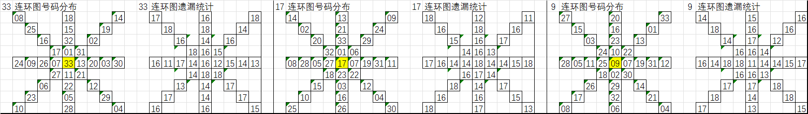 由于数据量大,不一一统计,下图为各个号码分别在33、17、9连环图上的遗漏统计汇总图: