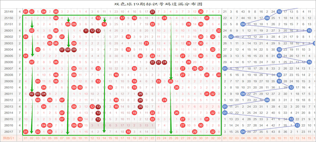 以上是33、17、9的连环图,可以在一起彩平台的九转连环图中查看历期号码分布,以当前期数来看,我们以19期号码来进行遗漏统计,然后把每个号码在近19期的遗漏总数统计出来,分别带入33、17、9的连环图,取出遗漏值大于16的号码,把这些号码在“环上”和“轴上”的相邻号码取出来进行统计,选取出次前15的号码作为大底。