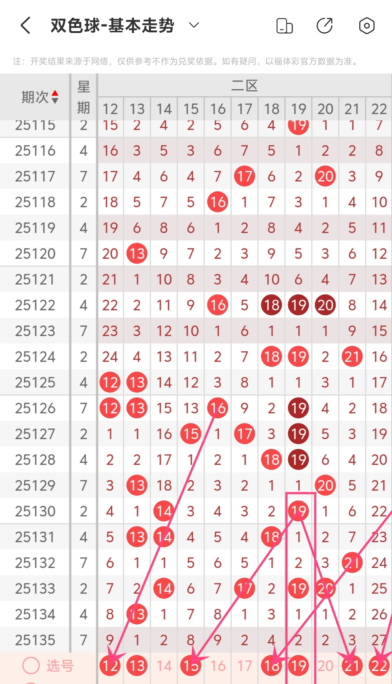 上期第二区间开出走空,本期我们可以从上面走势图中看到选号的思路,12为斜连走势,15为斜连走势,18为斜连走势,19为对称走势,21为斜连走势,22为斜连走势,综合以上分析本期第二区间推荐12 15 18 19 21 22
