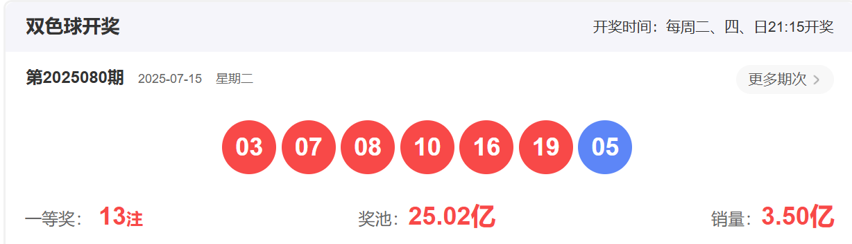 一、上一期开奖情况:福彩双色球上一期开奖号码为:03-07-08-10-16-19 05,极距为16,红球三区比4:2:0,红球质合比为3:3,红球奇偶比为3:3,012路比1:4:1,上一期蓝球开出号码为05,为奇数、小数、质数、2路号码。