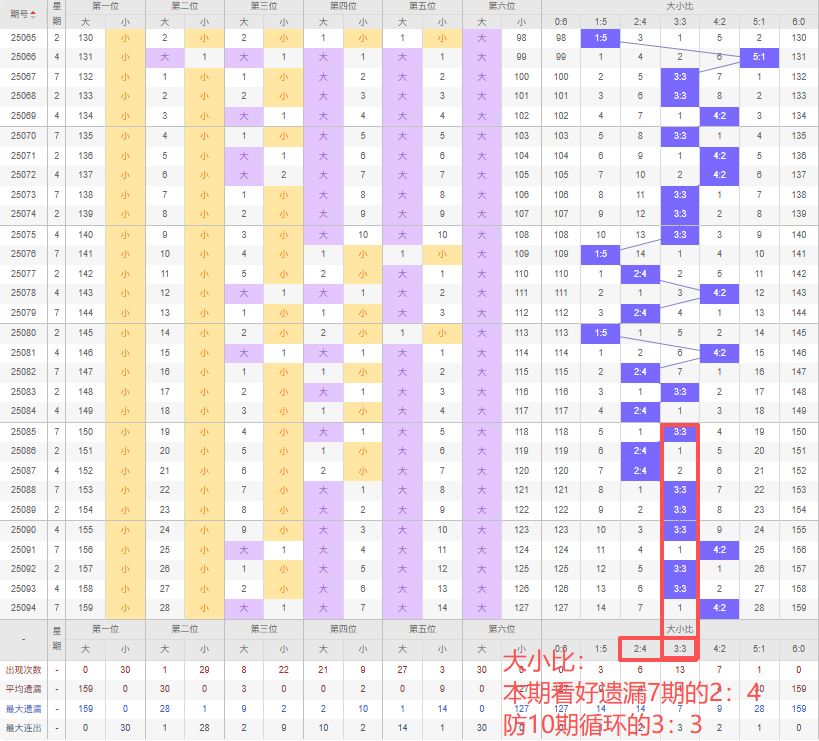 上期大小比:4:2,近10期大小比出现情况:3:3、2:4、2:4、3:3、3:3、3:3、4:2、3:3、3:3、4:2,最近10期出现5期3:3,出现3期4:2,出2期2:4,出现0期5:1,出现0期1:5,出现0期6:0,出现0期0:6,根据近10期规律本期看好遗漏7期的2:4,防10期循环的3:3,综上所述推荐大小比推荐:3:3,重点关注:2:4。