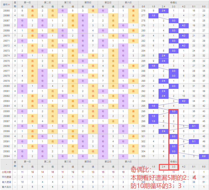 上期奇偶比:6:0,近10期奇偶比出现情况:3:3、1:5、1:5、5:1、2:4、3:3、5:1、3:3、3:3、6:0,最近10期出现5期3:3,出现0期4:2,出现1期2:4,出现2期5:1,出现2期1:5,出现1期6:0,出现0期0:6,根据近10期规律本期看好遗漏5期的2:4,防10期循环的3:3,综上所述推荐奇偶比推荐:3:3,重点关注:2:4。
