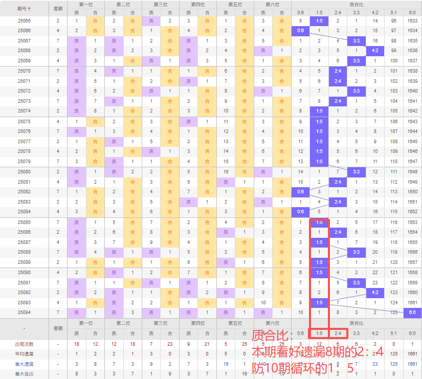 上期质合比:6:0,近10期质合比出现情况:0:6、1:5、2:4、1:5、3:3、1:5、1:5、3:3、4:2、1:5、6:0,最近10期出2期3:3,出现1期4:2,出现1期2:4,出现0期5:1,出现5期1:5,出现1期6:0,出现0期0:6,根据近10期规律本期看好遗漏8期的2:4,防10期循环的1:5,综上所述推荐质合比推荐:1:5,重点关注:2:4。