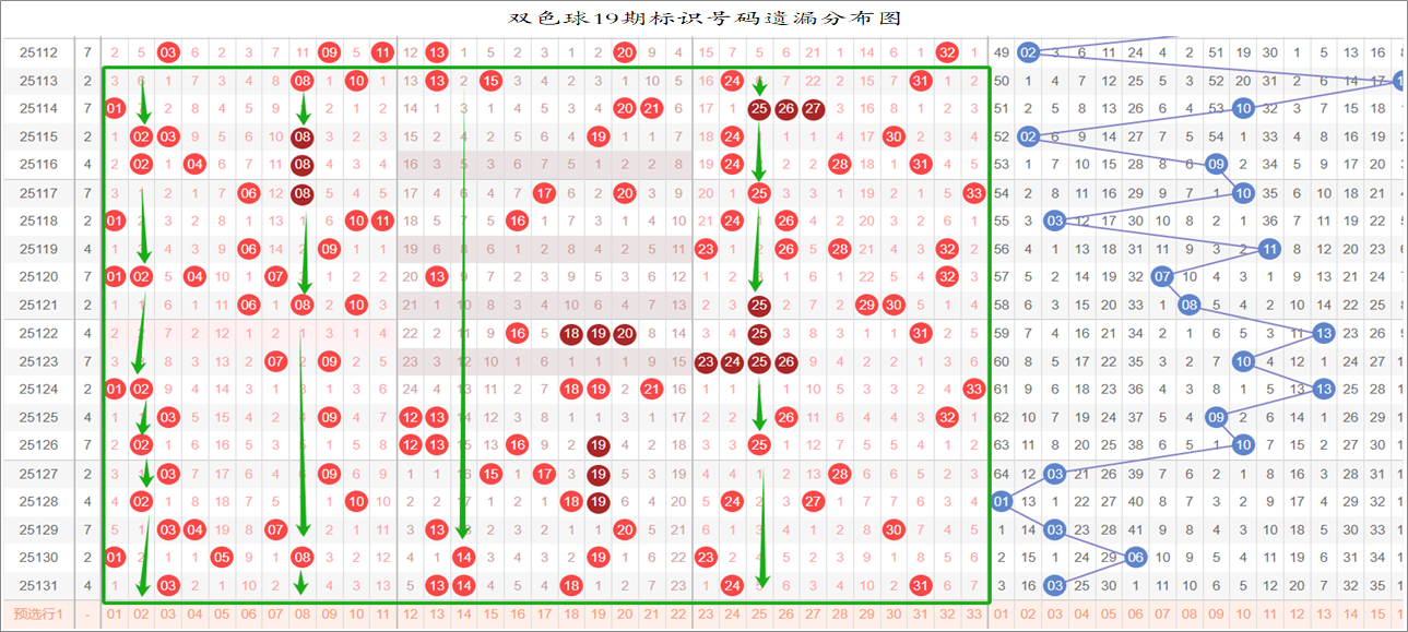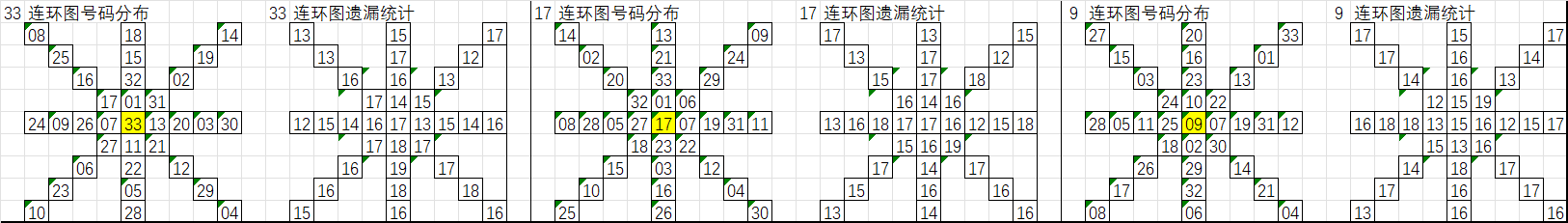 由于数据量大,不一一统计,下图为各个号码分别在33、17、9连环图上的遗漏统计汇总图: