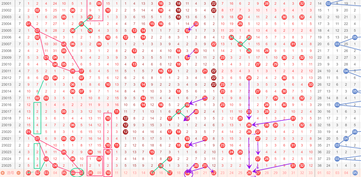 三区(23-33):024期开出31、32连号结尾,同23期相比,28红球开出比上期上升3个高位,且同24期相比,31红球开出也是上升3个高位,看好该趋势往后前偏移三个高位至4个高位,因此重点关注27.28出号,另需特别注意防守高位冷号出球30,以及26跟随开出,再次已连号结尾的方式进行常态三连互补;综上述,本期看好:27、26进行结尾开出,且需注意防守30.28开出;三区重点关注:26.27小或是挑选30.28
