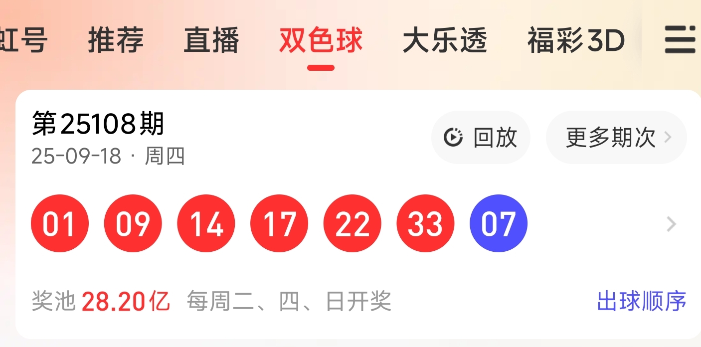 第25108期双色球文章中推荐中命中01,09,17,22等4个红球。