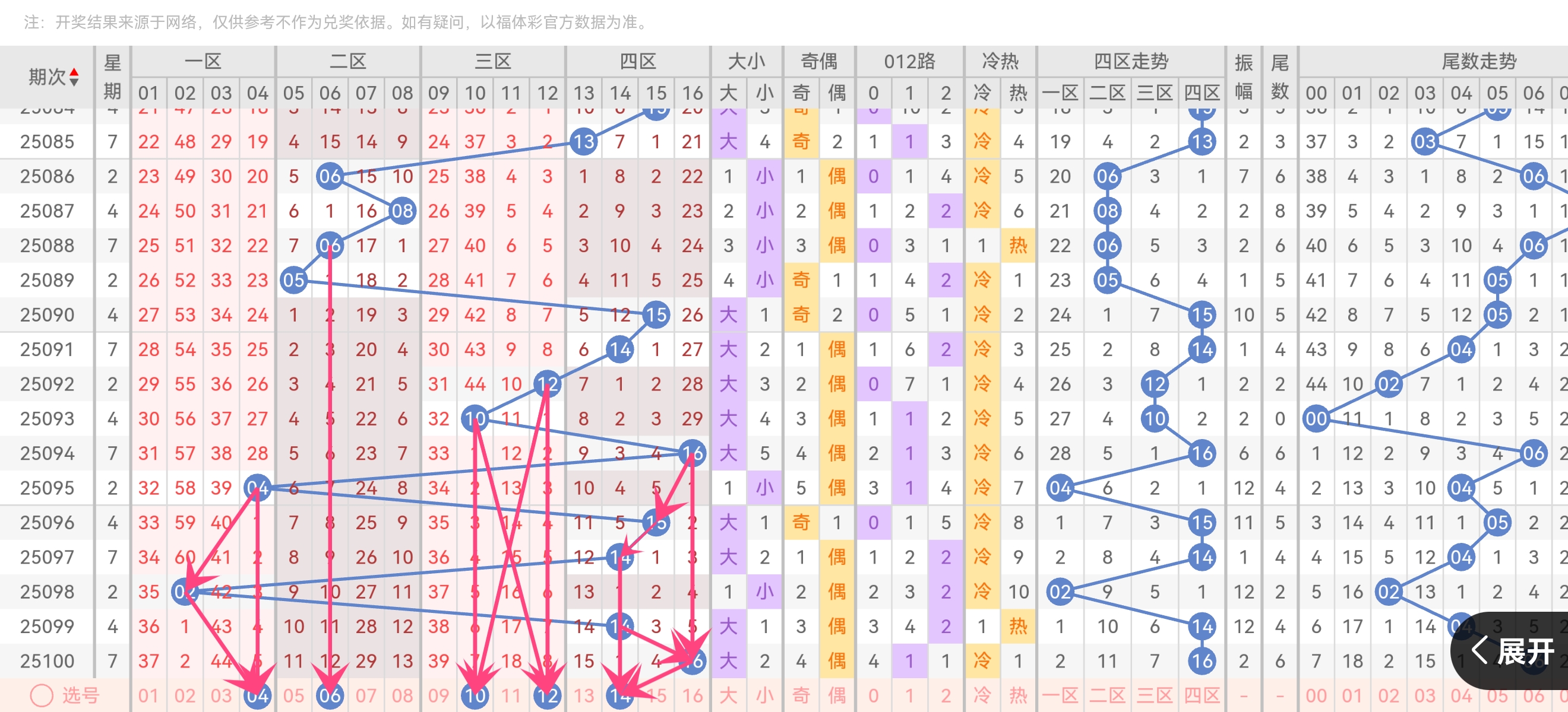 上期质数号码:17(1个)合数号码:12 16 25 30 31(5个)近期质数持续走弱,建议本期关注2-3个质数红球路数分析