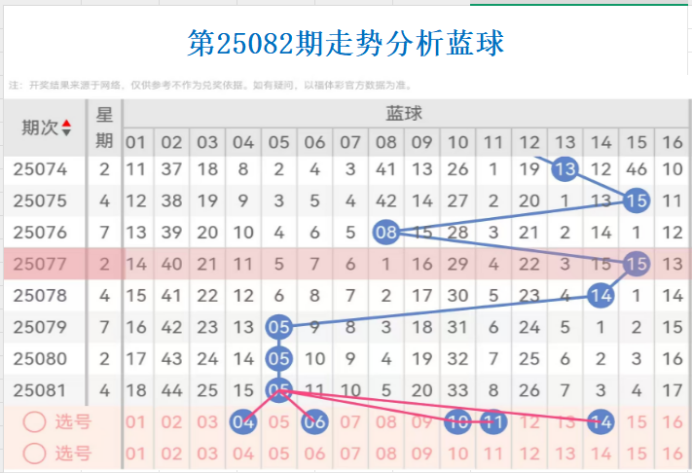 - 大小分布:从蓝球的大小号来看,小号(01-08)回补较为强势,因此选取了04和06;大号(09-16)则选取了10、11和14。